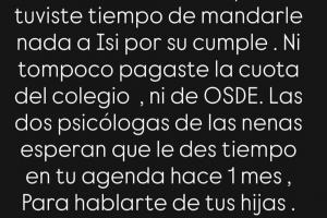 旺达:真可惜,你没能按学校要求参加今天的线上家长会,和女儿们一起通过Zoom(视频会议软件)参会。你也没时间给伊西送任何生日礼物。学校的费用、医疗保险的费用你也都没交。女儿们的两位心理医生一个月前就希望你能在日程中留出时间,和她们聊聊你的女儿们。对自己的两个女儿都没时间的人,需要有人提醒他吗?没有你这个‘爸爸’的存在,我也不会让她们缺任何东西。我提醒你,这只是为了防止你哪天想花钱把我的女儿们从我身边夺走。